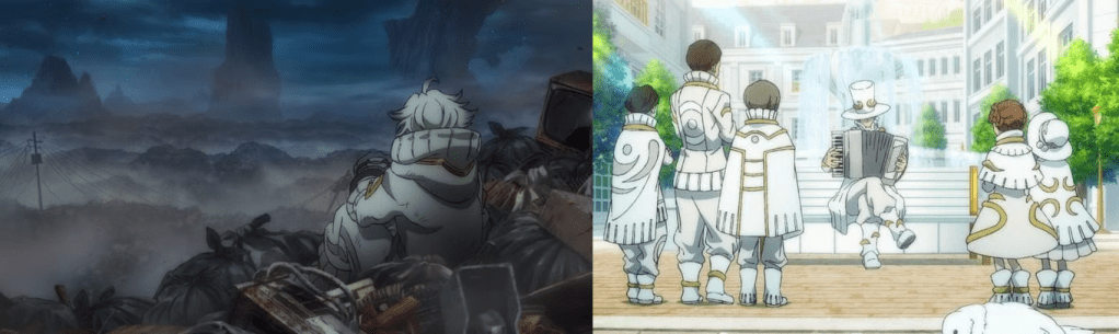 The world of Gachiakuta is split into two main places: the Sphere and the Pit. The Sphere is where the rich and powerful live. Everything is clean, bright, and almost painfully white. White clothes, white buildings, white surroundings. It’s meant to look pure, perfect, and untouchable. Meanwhile, below the Sphere is the Pit—a massive dumping ground where trash, broken objects, and even people are thrown away like they never mattered.